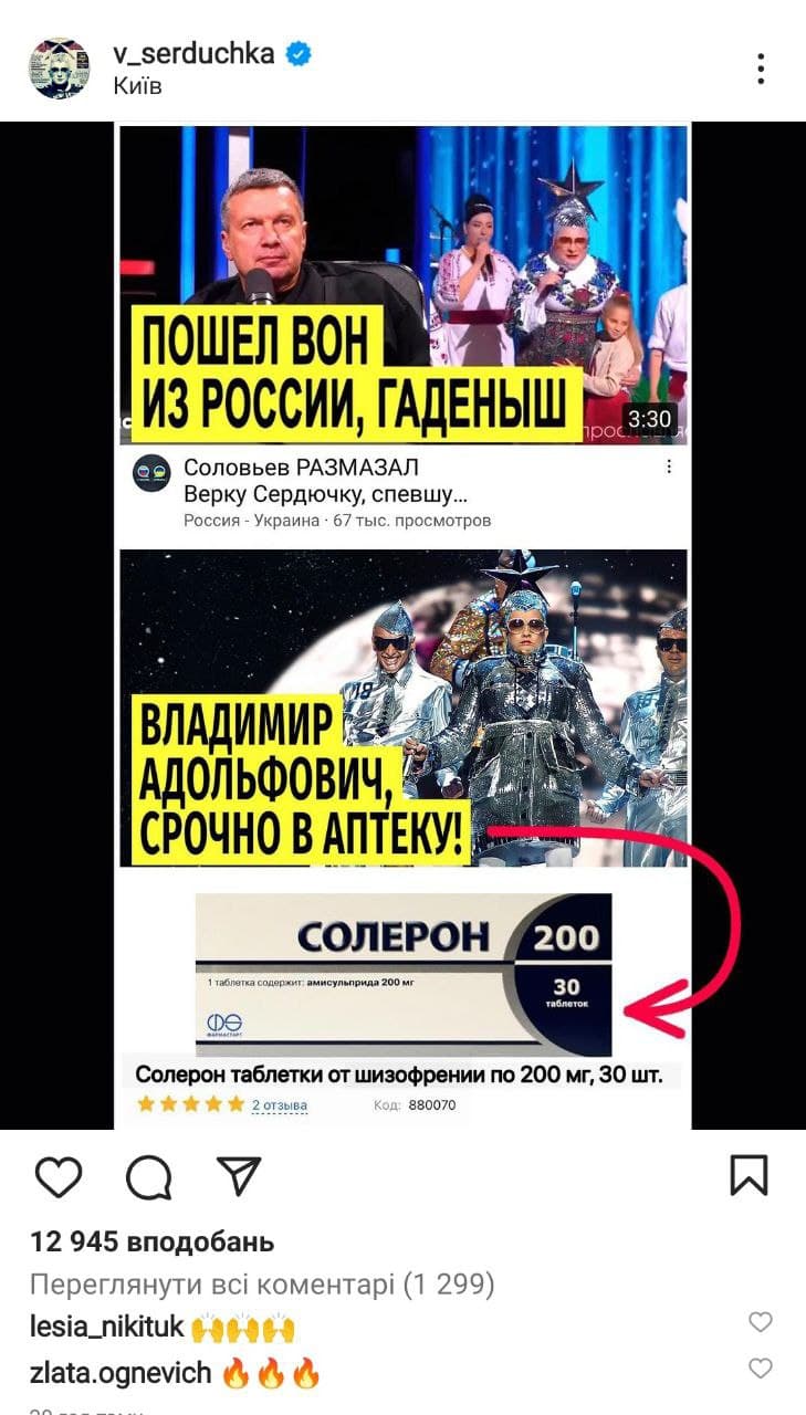 Данилко не стал отмалчиваться, и в своем Instagram опубликовал ответ. "Владимир Адольфович, срочно в аптеку", - написал он и показал коллаж с фотографией лекарства от шизофрении.