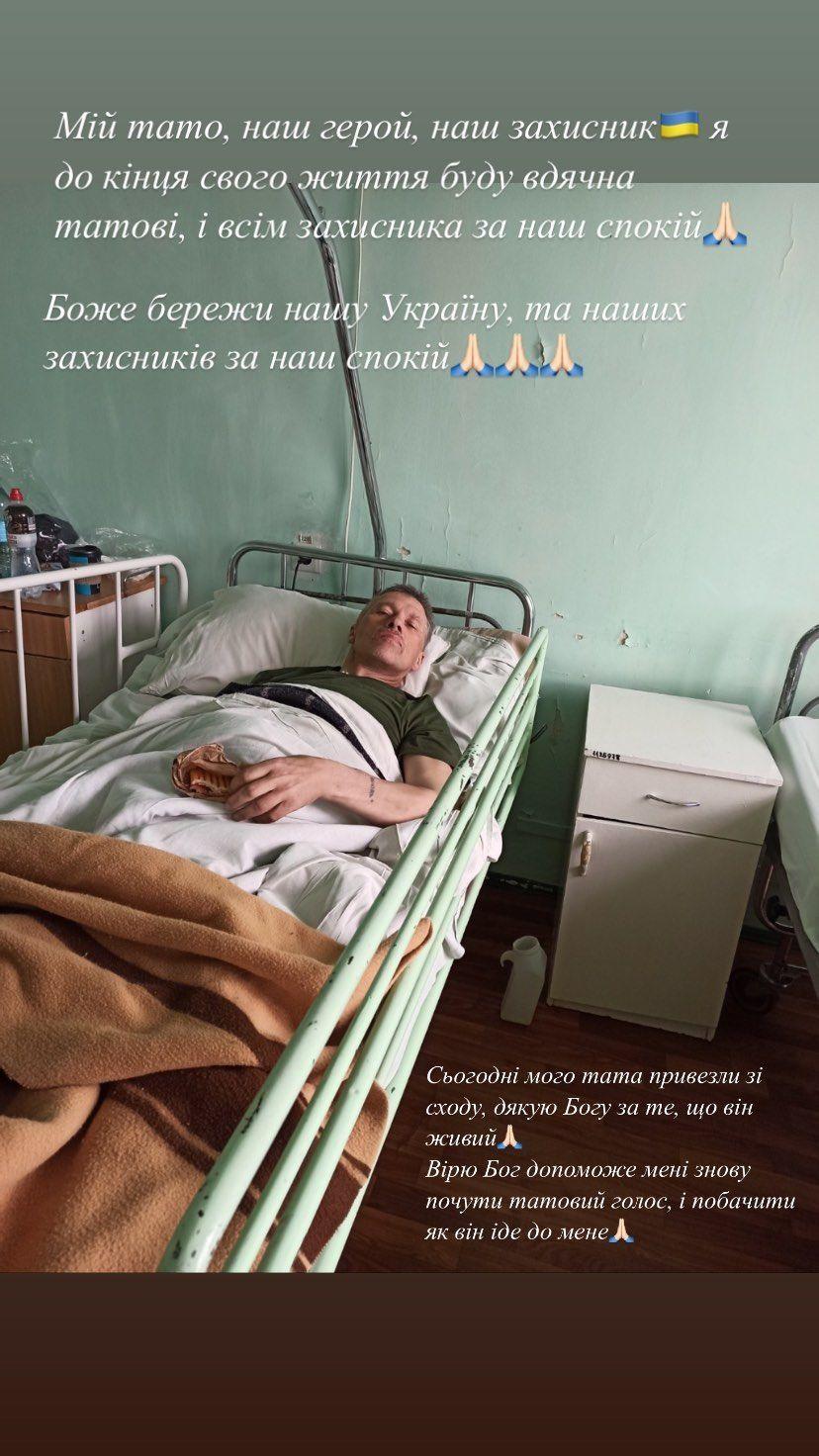"Мой папа, наш герой, наш защитник. Я до конца своей жизни буду благодарна папе и всем защитникам за наш покой. Боже, храни нашу Украину, - написала девушка, показав фото отца в больнице. - Сегодня моего папу привезли с востока, спасибо Богу за то, что он живой. Верю, Бог поможет мне опять услышать папин голос, увидеть, как он ко мне идет".