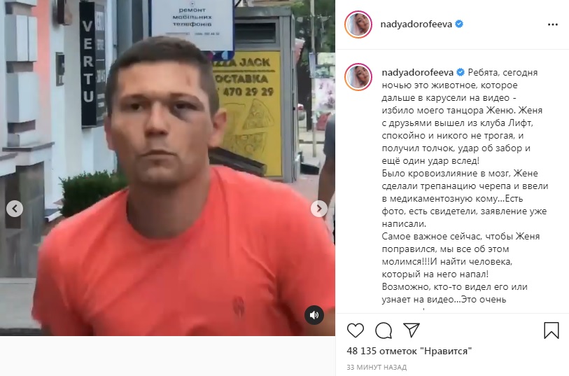 В сети появилось видео нападения сотрудника УГО Евгения Беспалого на 22-летнего Евгения Гончаренко, танцора из балета Нади Дорофеевой. Как сообщалось ранее, парень получил сильный удар в голову, из-за чего у него произошло кровоизлияние в мозг. Врачи ввели Гончаренко в состояние медикаментозной комы.