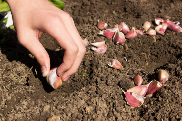 Зубчики следует высаживатьна расстоянии примерно 7-8 см друг от друга. Между рядками должно оставаться примерно 20 см. Чеснок садят на глубину около 4 см.