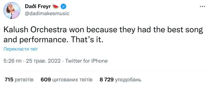 "Kalush Orchestra победили, потому что у них была лучшая песня и исполнение. Вот и все", - лаконично высказался он в Twitter.