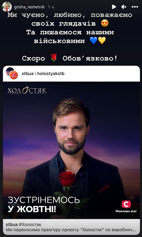 Ведущий "Холостяка" Григорий Решетник написал, что телеканал ценит своих зрителей и пообещал, что затягивать с премьерой не будут. "Мы слышим, любим, уважаем своих зрителей. И гордимся нашими военными. Скоро! Обязательно!", - написал телеведущий у себя в "сториз".