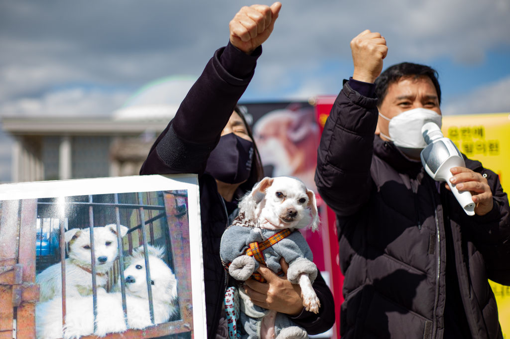 Активисты в Южной Корее призывают внести поправки в Закон о защите животных для запрета убоя собак и собачьего мяса, март 2021 года.