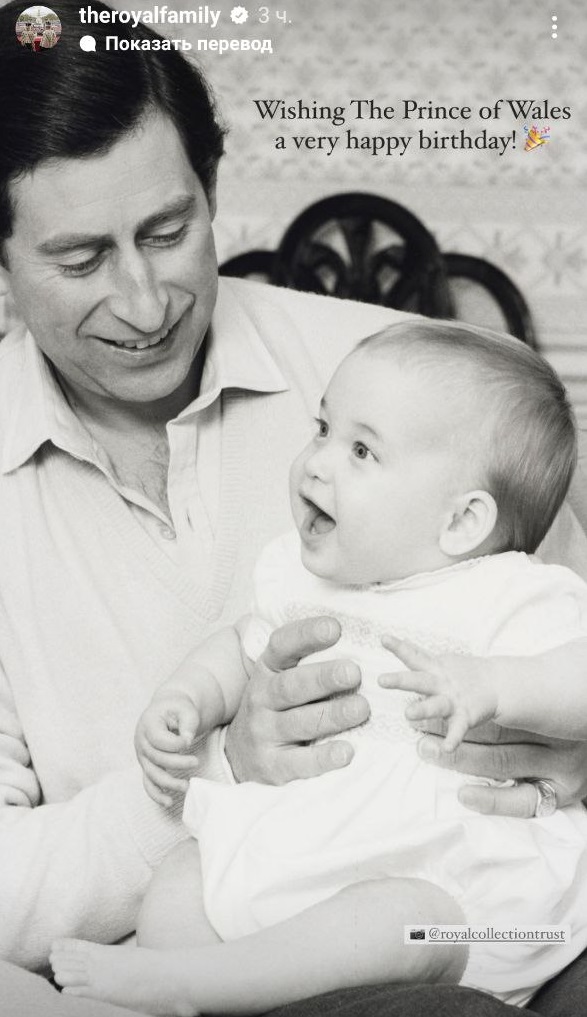 Поздравили именинника и в профиле theroyalfamily – в Instagram-stories поделились милым архивным фото, на котором молодой Чарльз III держит на рукахпринца Уильям, которому около полугода.