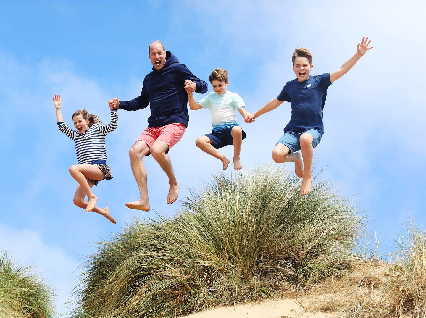 На фото изображен принц Уильям со своими тремя детьми: 11-летним Джорджем, 9-летней Шарлоттой и 6-летнем Луи. Семья запечатлена во время прыжка.