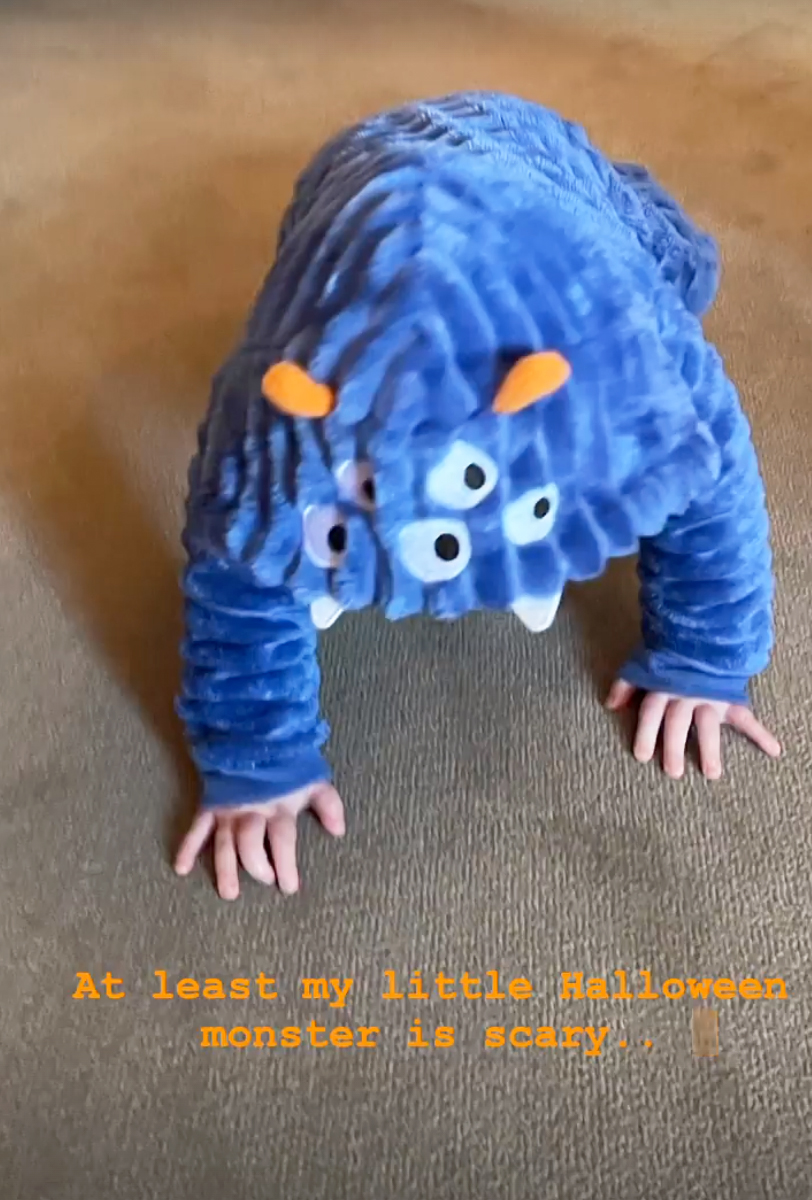 "Интересно, о чем они говорят", - подписала она милый снимок, на котором Август одет в плюшевый костюм монстрика с пятью глазами и оранжевыми рожками.