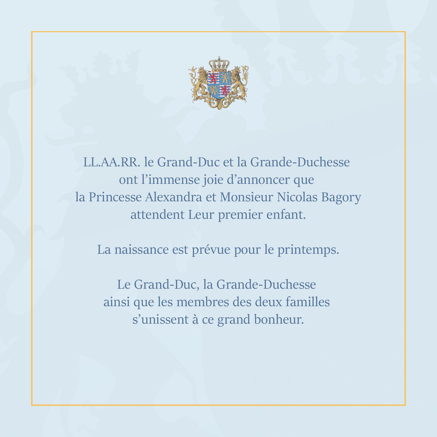 Радостной новостью королевская семья поделилась на своей странице в Instagram. В частности, в фотоблоге появилось официальное заявление: "Их Королевские Высочества Великий Герцог и Великая Княгиня с огромной радостью сообщают, что принцесса Александра и господин Николя Багори ждут первенца. Роды запланированы на весну. Великий Князь, Великая Княгиня, а также очлены обеих семей разделяют это великое счастье".