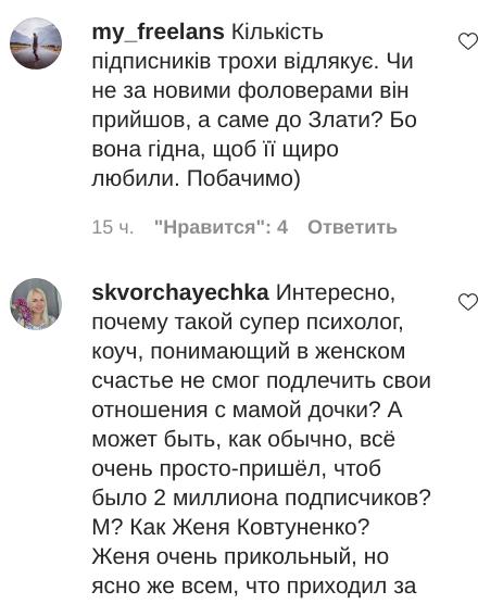 "Интересно, почему такой супер психолог, коуч, понимающий в женском счастье не смог подлечить свои отношения с мамой дочки? А может быть, как обычно, все очень просто - пришел, чтоб было 2 миллиона подписчиков?"