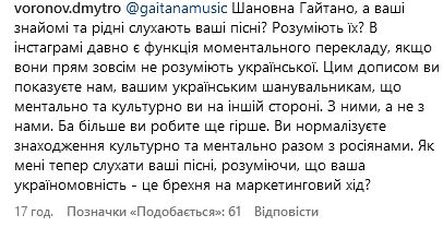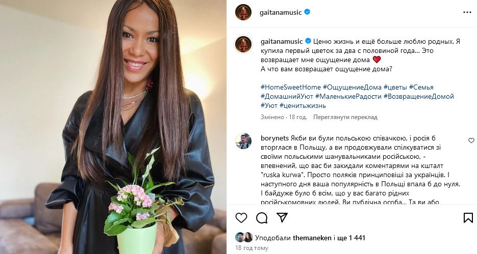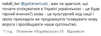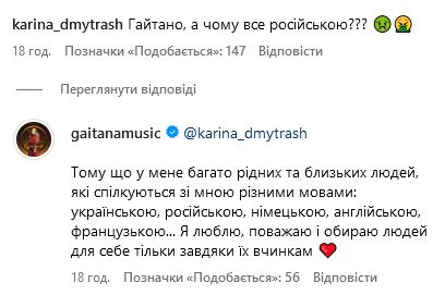 На вопросы подписчиков, почему она продолжает выставлять в информационное пространство посты на русском языке, Гайтана ответила, что имеет родственников, которые якобы не поймут текст на украинском.