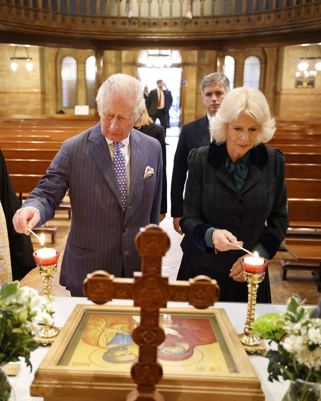 Король и королева зажигают свечу в Украинском католическом соборе в Лондоне в 2022 году