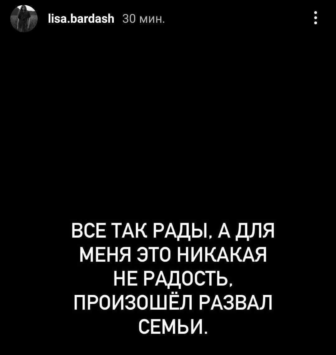 Девушка выложила Instagram-историю, где на черном фоне написала, что она болезненно переживает разрыв с отцом своего ребенка. "Все так рады, а для меня это никакая не радость. Произошел развал семьи", - прокомментировала она.