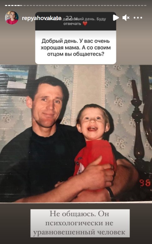 "У вас очень хорошая мама. А со своим отцом вы общаетесь?" - поинтересовались у Репяховой. - "Не общаюсь. Он психологически неуравновешенный человек", - коротко ответила девушка.