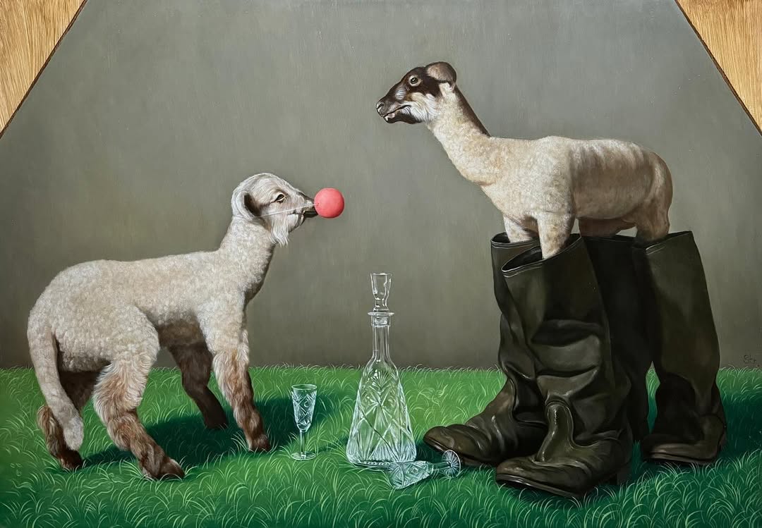 В подиумной версии изображения частично изменили. К примеру, один из ягнят на картине получил новую деталь. Если в оригинальной работе он изображен в деревенских резиновых сапогах, то в версии для коллекции – в люксовых сапогах с фирменной монограммой LV.