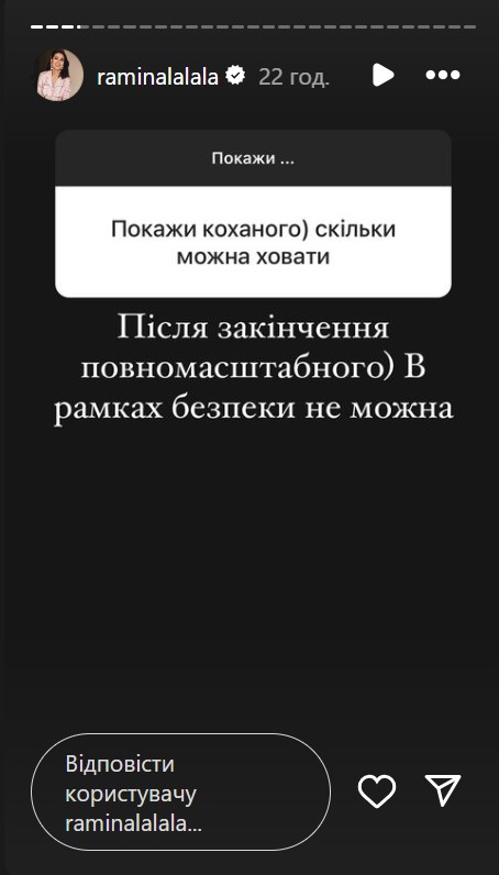 Рассекретить детали личной жизни журналистка решила во время общения с подписчиками в Instagram. После того, как кто-то из пользователей попросил ее показать любимого, она ответила, что не торопится это делать, поскольку ждет подходящего момента. "По окончании полномасштабной войны. В рамках безопасности нельзя", - написала интервьюер, тем самым дав понять поклонникам, что ее новый избранник, вероятно, является военнослужащим.