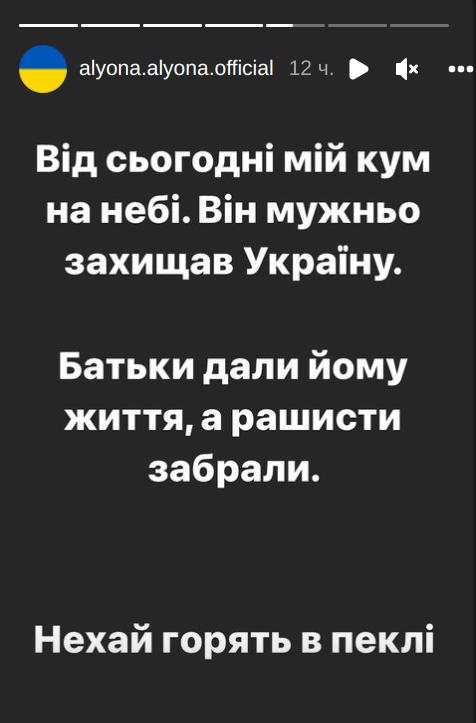"С сегодняшнего дня мой кум на небе. Он мужественно защищал Украину. Родители дали ему жизнь, а рашисты забрали. Пусть горят в аду", - написала Алена в Instagram-историях.