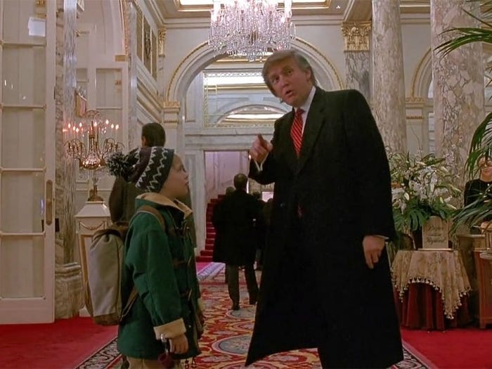 В фильме герой Маколея Калкина Кевин оказывается в Нью-Йорке и останавливается в шикарном отеле Plaza, который в то время принадлежал Дональду Трампу. Коламбус планировал заплатить владельцу отеля гонорар, как обычно бывает при съемках в таких местах, но Трамп захотел большего.