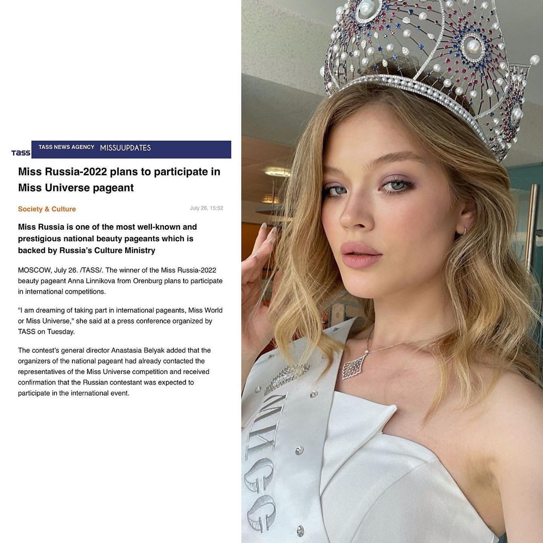 Так, директор конкурса "Мисс Россия" Анастасия Беляк на пресс-конференции заявила, что Линникова примет участие в 71-м конкурсе "Мисс Вселенная". "Они с удовольствием ждут нашу новую победительницу", - говорится в сообщении.