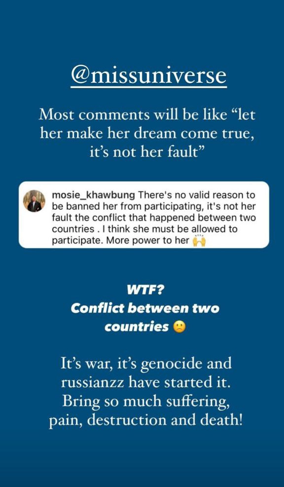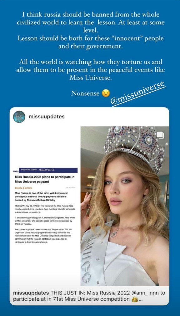 "Я считаю, что россию следует забанить во всем цивилизованном мире, чтобы они усвоили урок. Хотя бы на каком-то уровне. Урок должен быть для всех - для "невинных людей" и для их правительства. Весь мир смотрит, как они пытают нас, и разрешает им присутствовать на мирных событиях, таких как "Мисс Вселенная". Бессмыслица, - пишет Неплях. - В комментариях говорят: "Дайте ей исполнить мечту, это не ее вина, а конфликт между двумя странами". Какого черта? Конфликт между двумя странами? Это война, это геноцид, и русские это начали. Принесли так много страдания, боли, разрушений и смертей!"
