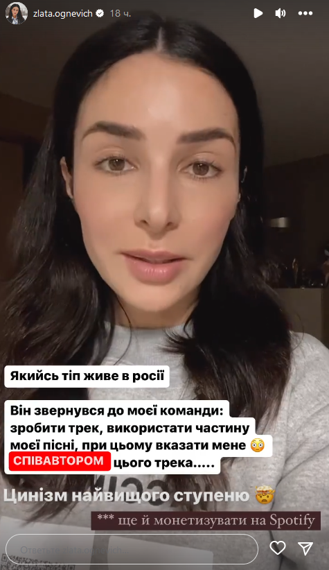 "Это вообще свирепый кринж. Какой-то тип, живущий в России, обратился к моей команде, чтобы выпустить трек с моим голосом, с частью моей песни. На Spotify он хочет это все монетизировать, популяризировать и указать меня соавтором трека. То есть по нам гатят ракетами, убивают людей, забирают территории, а мы должны с ними делать совместные творческие работы. Я понимаю, что там все очень грустно с пропагандой, с состоянием сознания и пониманием, но настолько быть циничными", - возмущается певица.