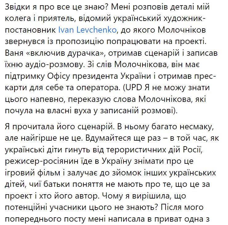 "Я прослушал телефонный разговор, во время которого режиссер пытался привлечь к съемкам украинских специалистов и должен сказать, этот парень очень уверен в успехе своего замысла. Хорошо. Россиянин хочет снять проукраинскую агитку, но есть нюанс... С одной стороны, почему к нам начинают ломиться те, что держат нос по ветру – хороший знак, а с другой – почему эти люди здесь? Почему "хорошие русские" не занимаются своими вопросами, а пытаются лезть в наши? Почему эти люди имеют поддержку от Офиса президента. Почему? И это на фоне того, что мы ищем деньги на свои проекты по всему миру и на каждом шагу должны доказывать, что имеем право на жизнь. Знаете почему? А потому, что им здесь "ничего за это не будет", а там будет", – также отметил он.