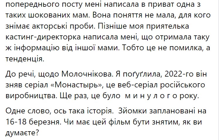 "Вскоре на костях и разорванных телах детей состоится съемка российского режиссера Александра Молочникова. Плакатная короткометражная работа о детях Бахмута. Съемки запланированы на 16-17-18 марта. Снимать они будут в реальных развалинах, - говорится в публикации Сауткина.