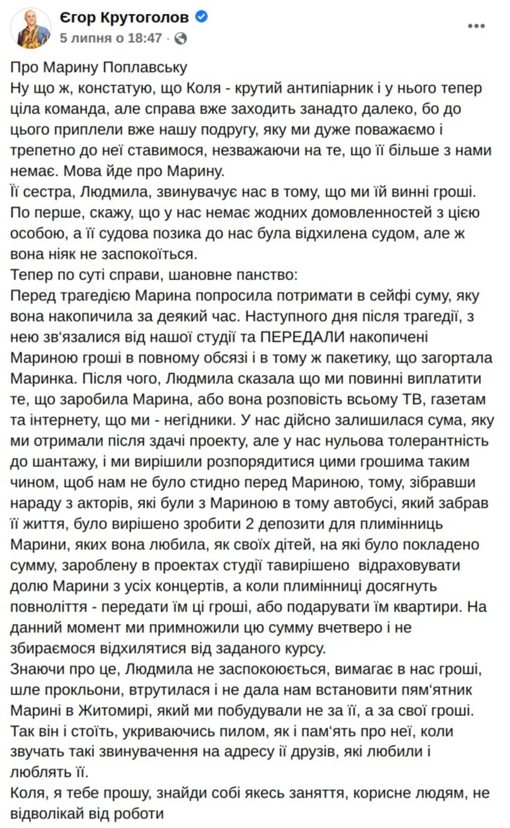 В ответ на это Егор Крутоголов написал в Facebook о том, что родственница Марины Поплавской занимается "вымогательством денег".
