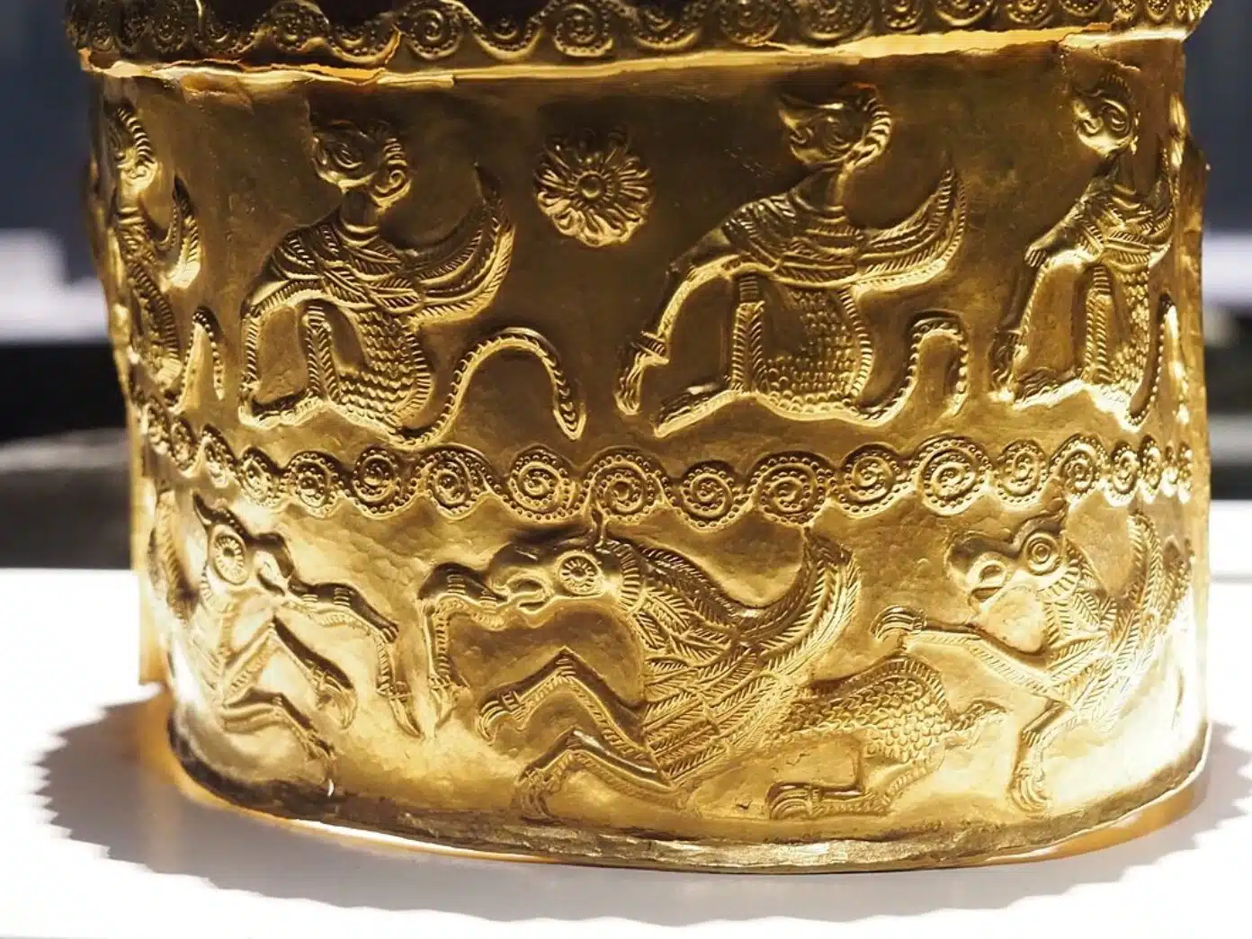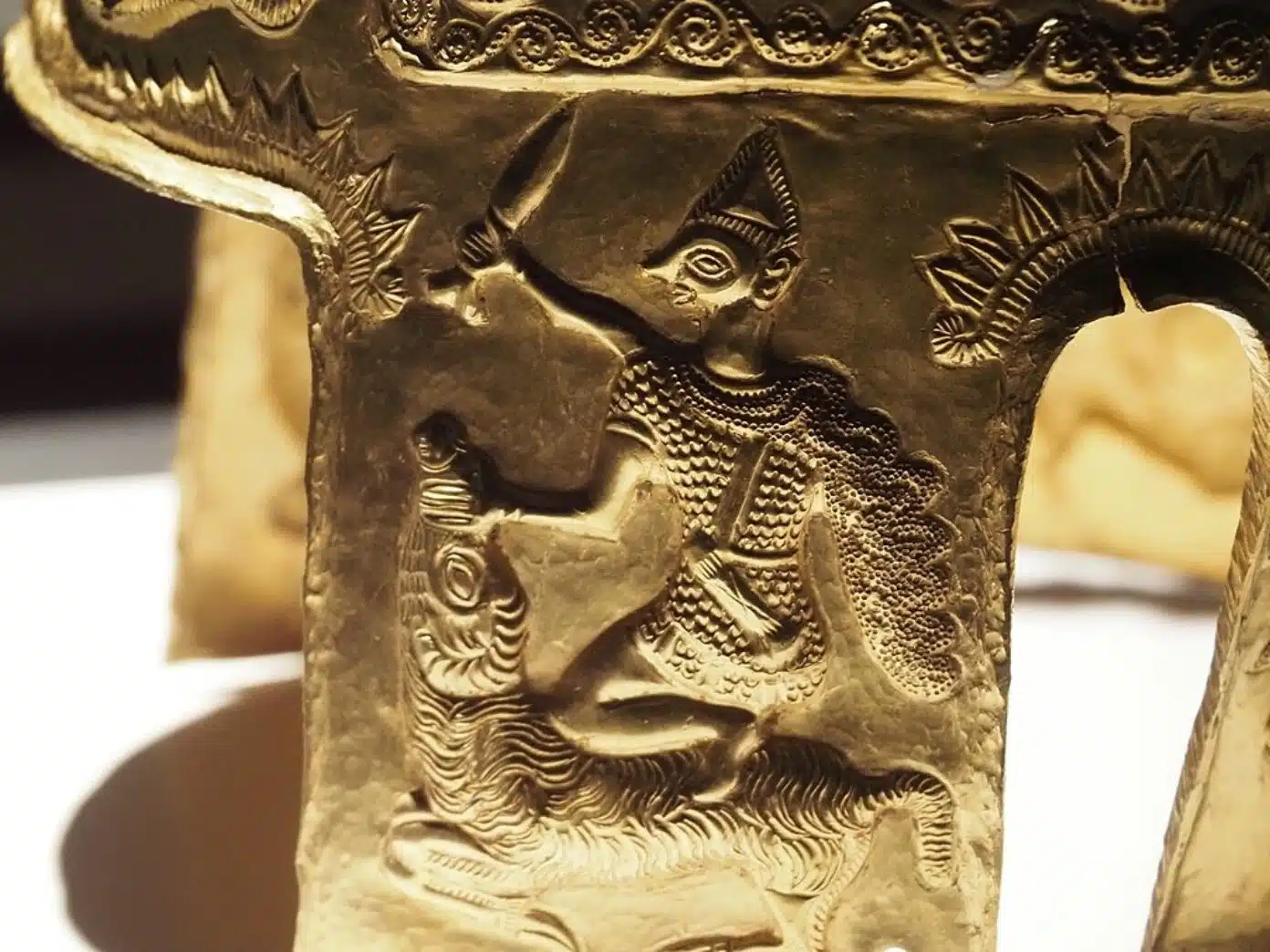 Артефакт изготовлен из золота или электрума – природного сплава золота с серебром и медью. Его вес составляет около одного килограмма. Подобные предметы были доступны только элите.