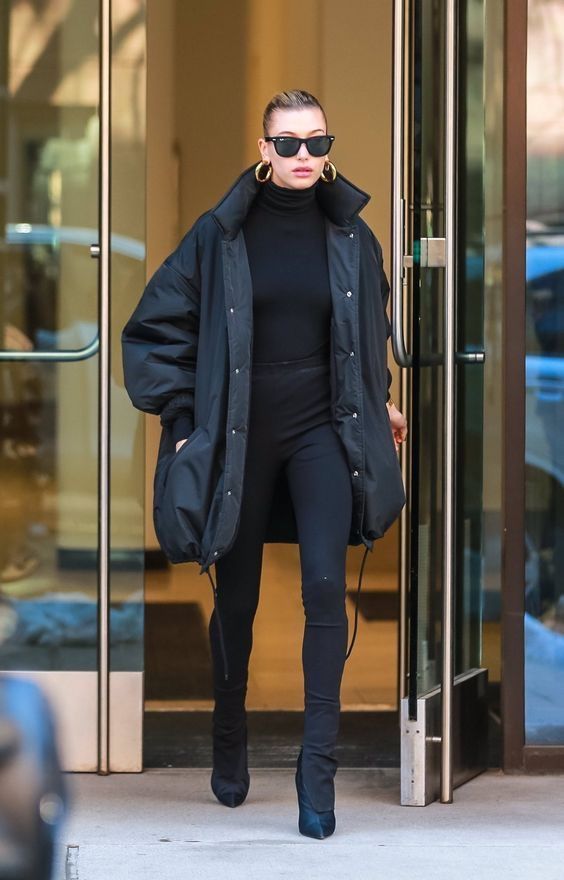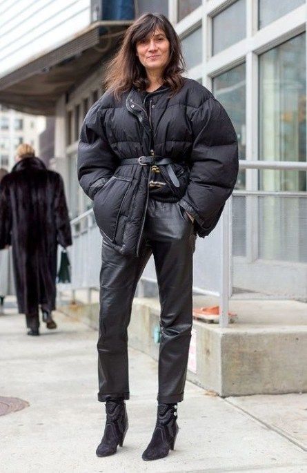 Одно из самых практичных и модных сочетаний – это черные леггинсы из эко-кожи и такого цвета дутая куртка. Этот образ не только защитит вас от холода, но и будет заметно стройнить.