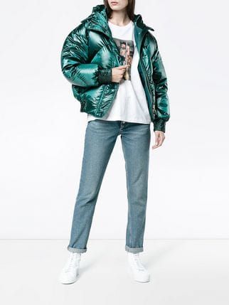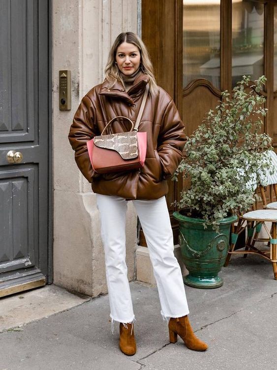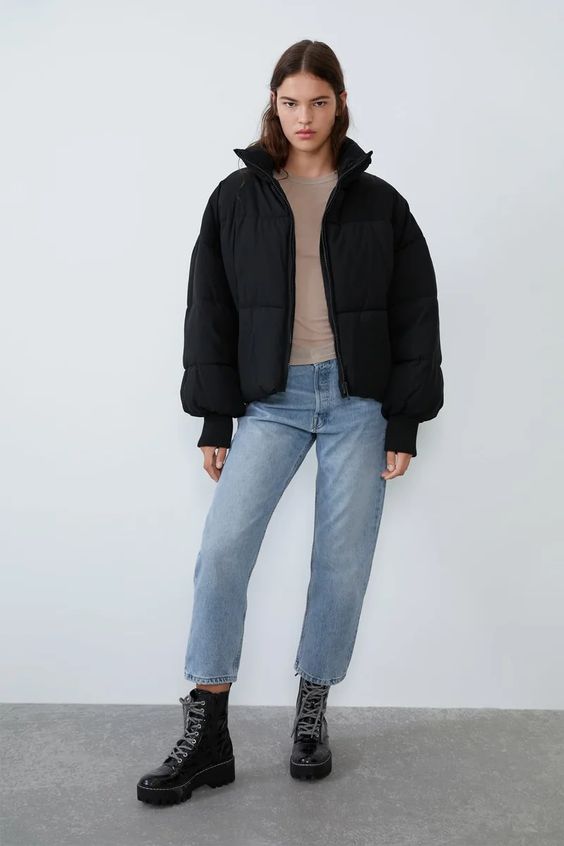 Дутая куртка отлично сочетается с различными видами джинсов – от скинни до широких джинсов клеш. Для завершения образа вы можете выбрать самую разнообразную обувь: и удобные кроссовки, и мюли, и лоферы, и грубые ботинки.