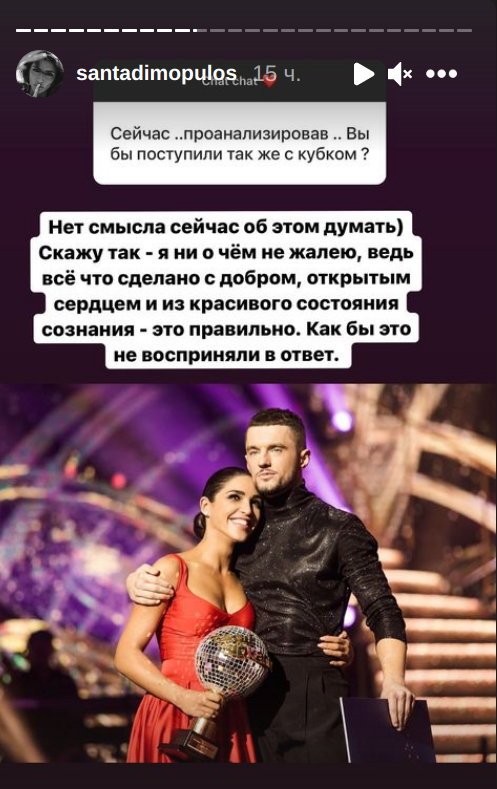 Широкий жест Санты Димопулос в финале "Танців з зірками" поняли не все: победительница отдала свой кубок Юлии Саниной, занявшей второе место. Вокалистка The Hardkiss подарок не приняла, назвав поступок Димопулос лицемерными унизительным.