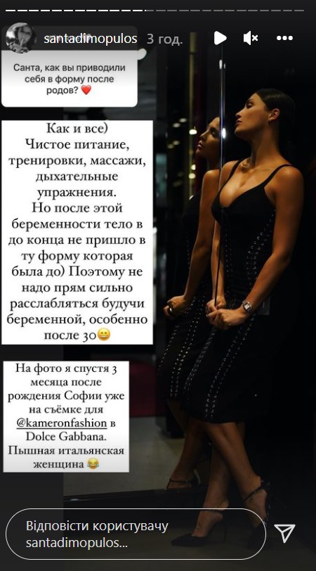 Подробнее об этом певица рассказала в своем блоге в Instagram. "Чистое питание, тренировки, массажи, дыхательные упражнения. Но после этой беременности тело не до конца пришло в ту форму, которая была. Поэтому не надо прям сильно расслабляться, будучи беременной. Особенно после 30-ти", - раскрыла секрет своей стройности Санта.