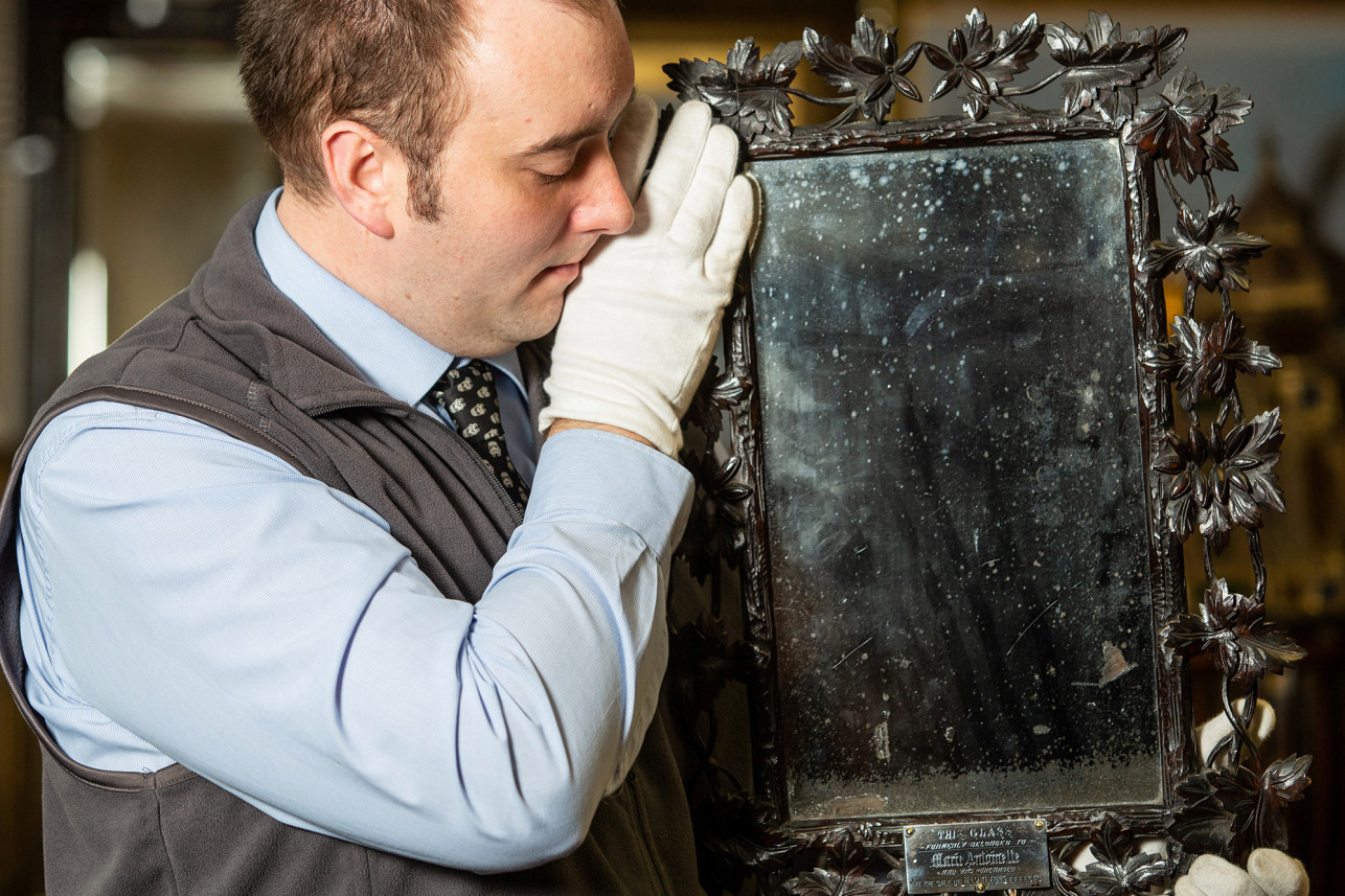 Тусклое старинное зеркало в кованой оправе размером 50х40 см висело в уборной, поскольку владельцы "никогда не думали, что оно чего-то стоит". Аукционист Эндрю Стоу рассказал, что они считали его "просто интересным". Но когда предмет отдали оценщику, тот обнаружил "замечательный бумажный след", который привел к каталогу аукциона 1880 года. Оказалось, зеркало продавали вместе с другими вещами покойного Наполеона III, а ему оно досталось с более крупной дворцовой коллекции Марии Антуанетты.