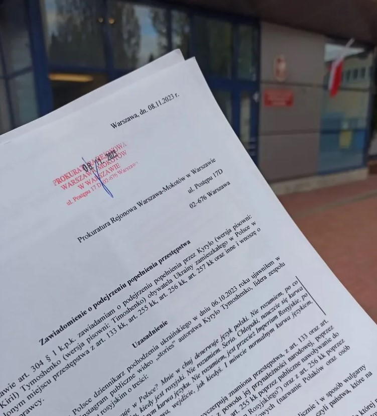 Об этом мужчина сообщил на своей странице в Twitter. Заявлением в польскую прокуратуру он решил отреагировать на призывы исполнителя к полякам "разговаривать на русском языке". Позже Тимошенко объяснил, что это была "неудачная острая шутка", но его оправдания не улучшили ситуацию.