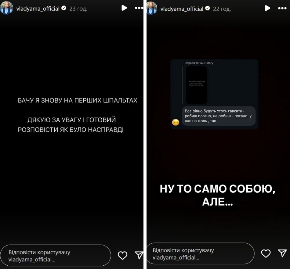 Танцовщик опубликовал несколько "историй" в Instagram, и в одной из них заявил, что готов рассказать, как все было на самом деле. Когда один из подписчиков написал, что мол это не поможет, потому что "все равно будут гавкать", хореограф согласился, но все же решил ответить. Правда не всем, а только "адекватным".