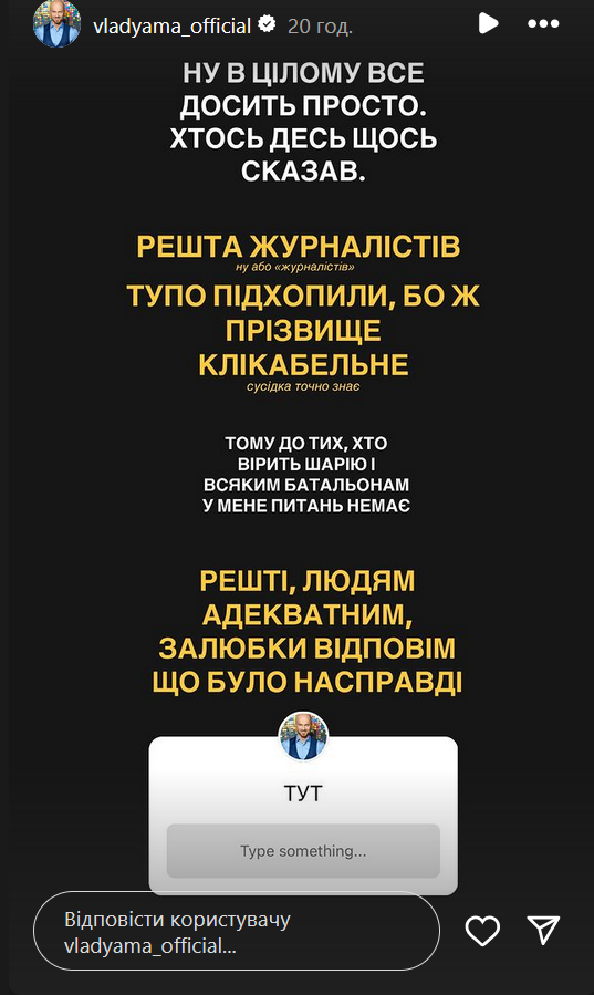 "Ну, в целом все достаточно просто. Кто-то где-то сказал. Остальные журналисты, ну или "журналисты", тупо подхватили, потому что фамилию кликабельная (соседка точно знает). Поэтому к тем, кто верит Шарию и всяким батальонам, у меня нет вопросов. Остальным людям адекватным, охотно отвечу, что было на самом деле", - написал Яма, оставив окошко для вопросов.