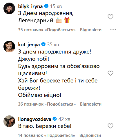В комментариях Дмитрия Дикусара поздравили поклонники, звездные друзья и коллеги – среди них Женя Кот, Илона Гвоздева, а также бывшая избранница Ирина Билык.