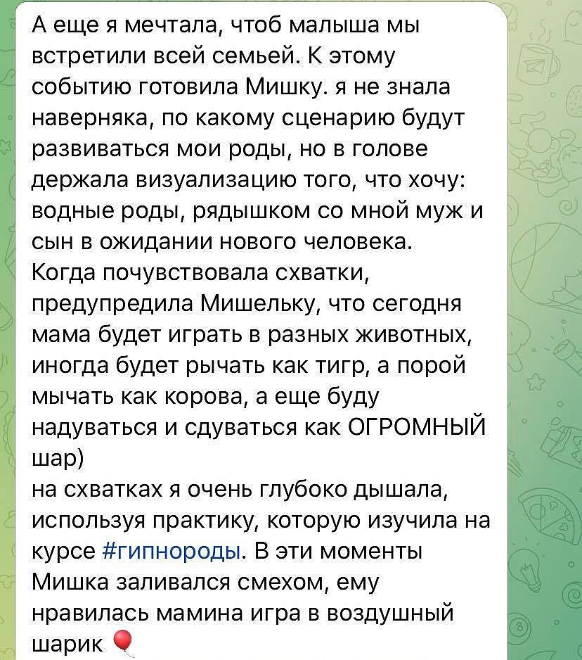 "Когда почувствовала схватки, предупредила Мишельку, что сегодня мама будет играть в разных животных, иногда будет рычать как тигр, а порой мычать как корова, а еще буду надуваться как огромный шар", - написала она в своем Telegram-канале.