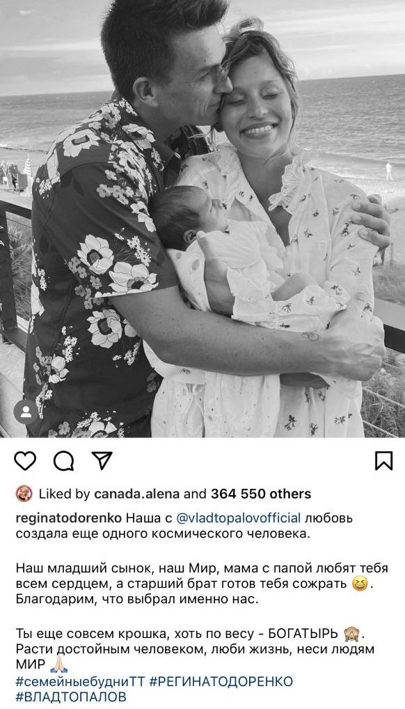 Недавно Регина Тодоренко родила второго ребенка от российского певца Влада Топалова. Судя по публикациям в Instagram, родители назвали мальчика Миром.