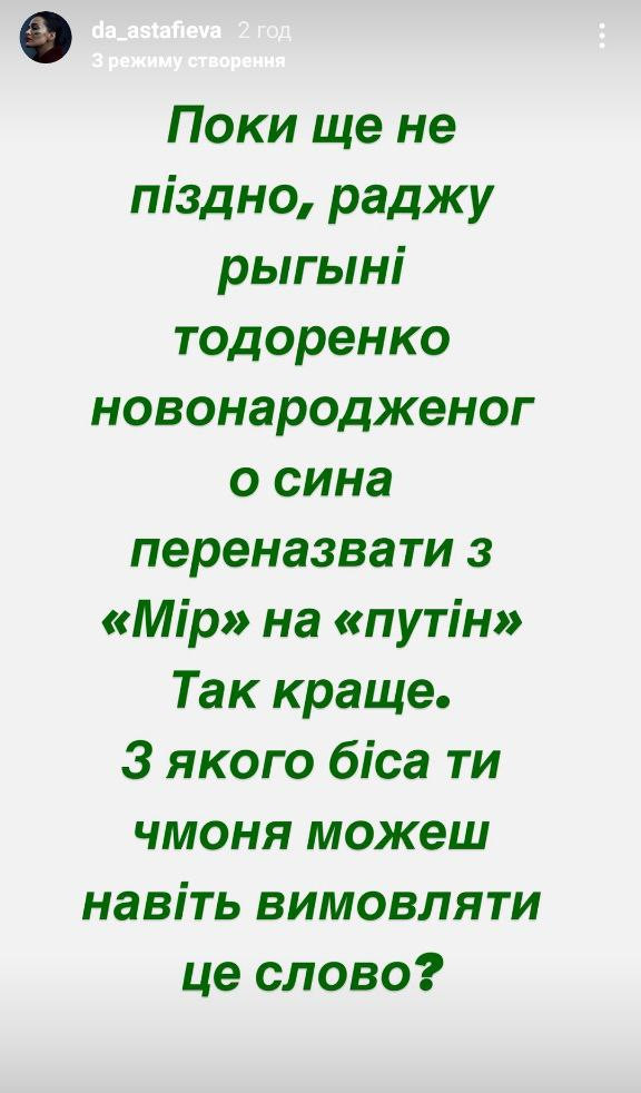 "Пока не поздно, советую Регине Тодоренко новорожденного сына переназвать с Мир на путин. Так лучше, - написала она в Instagram-историях. - Какого черта ты, чмоня, можешь даже произносить это слово?"