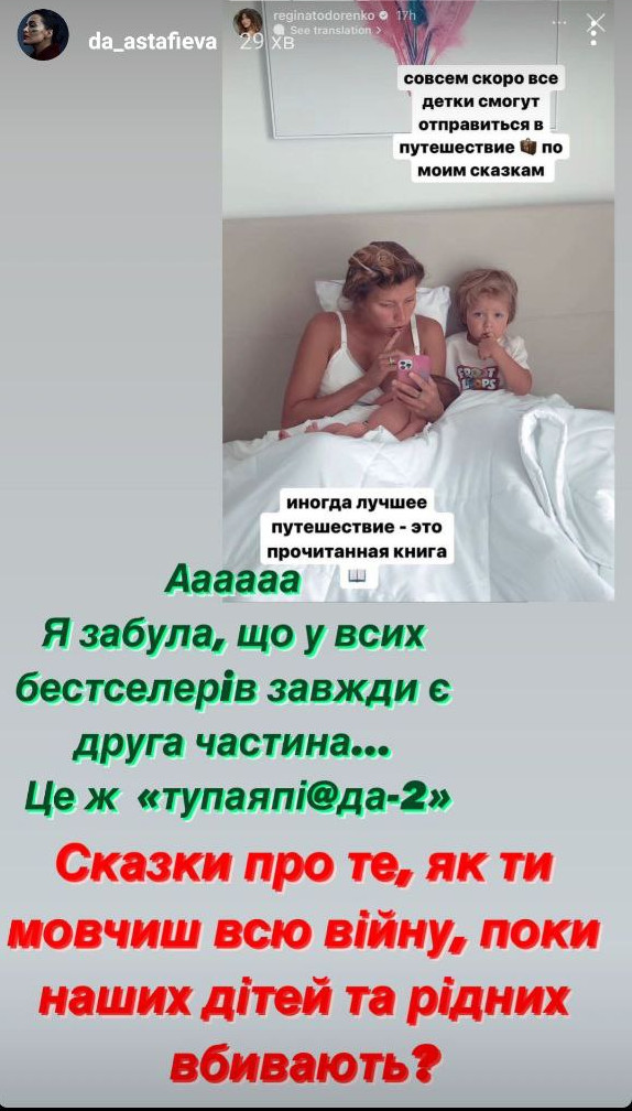 Также Тодоренко рассказала, что собирается издать книгу детских сказок "про забавную Регину Путешественницу, которая так любит спасать мир". Эта новость еще сильнее возмутила Дашу Астафьеву.