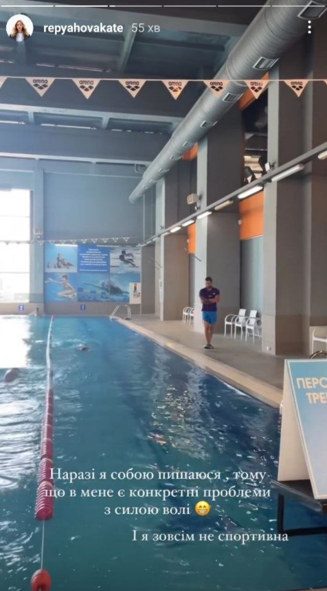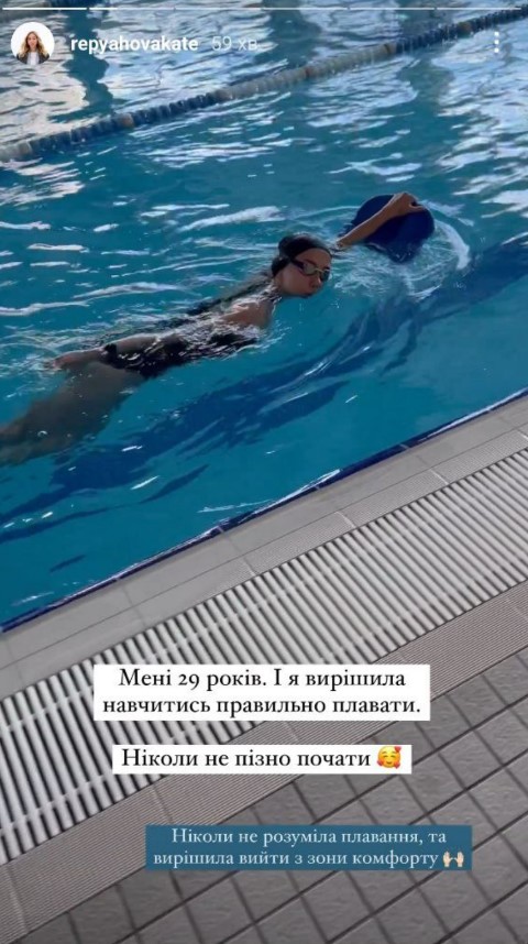 "Мне 29 лет. И я решила научиться правильно плавать. Никогда не поздно начать. Никогда не понимала плавание, и решила выйти из зоны комфорта. Пока я собой горжусь, потому что у меня есть конкретные проблемы с силой воли. И я совсем не спортивная", - прокомментировала Репяхова тренировки в бассейне.