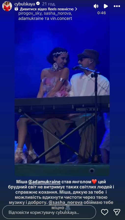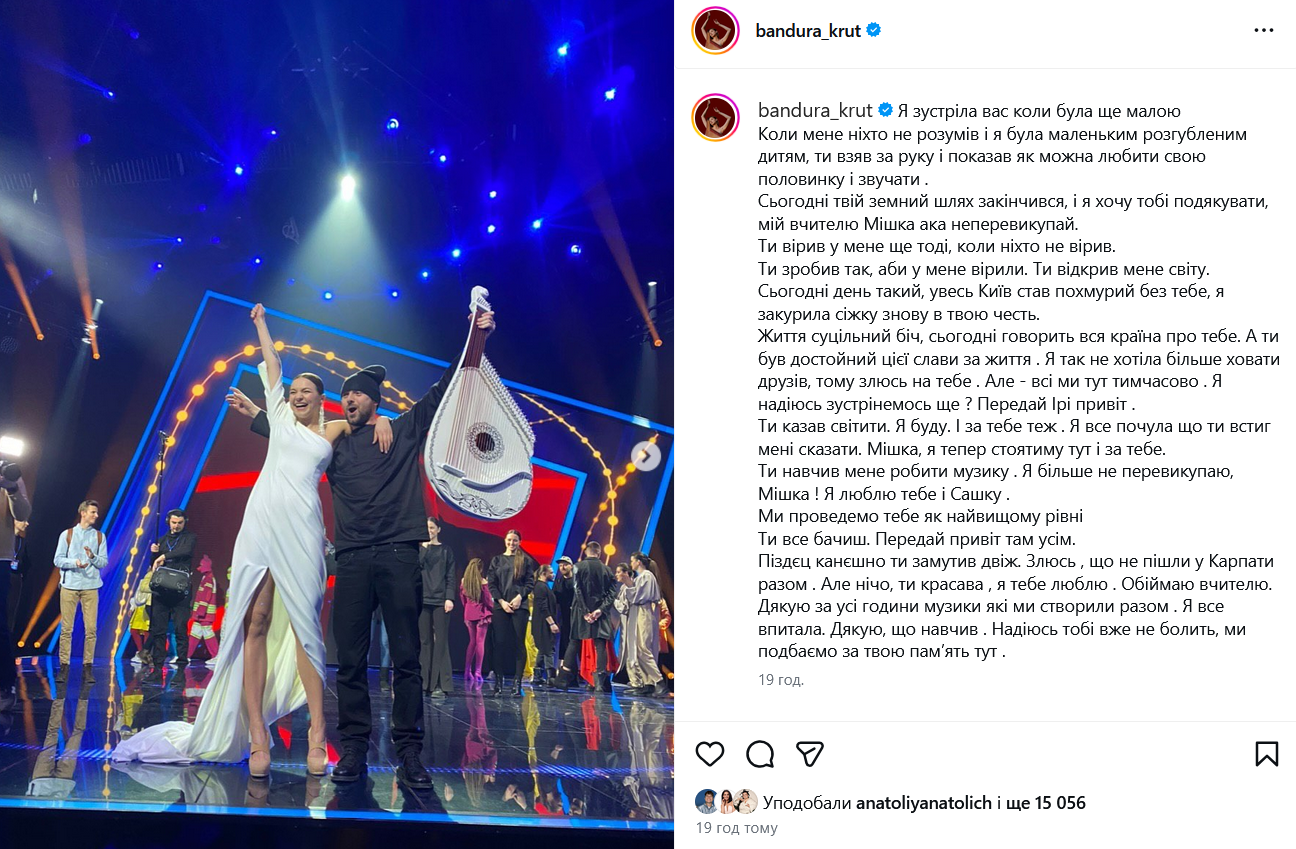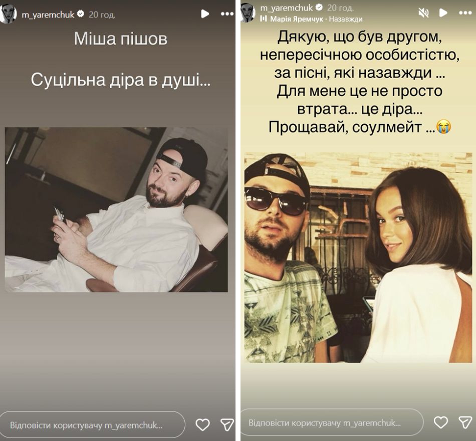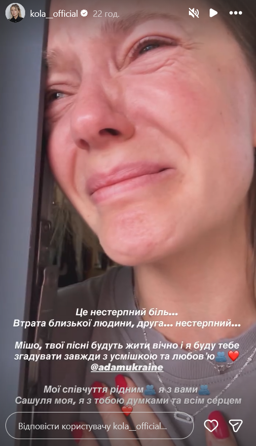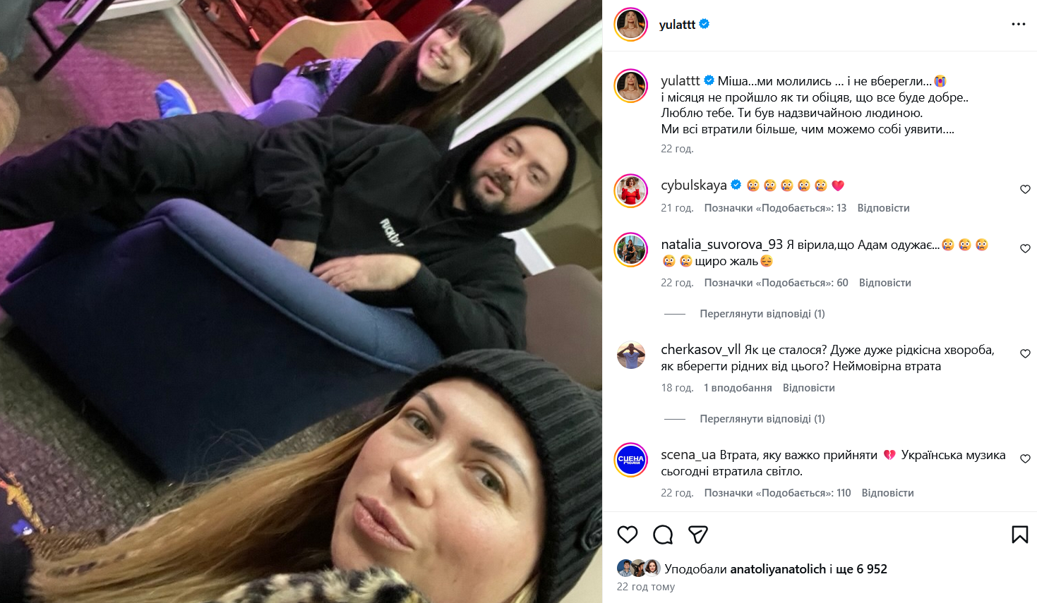 "Когда меня никто не понимал и я была маленьким растерянным ребенком, ты взял за руку и показал, как можно любить свою половинку и звучать. Сегодня твой земной путь закончился, и я хочу тебя поблагодарить, мой учитель Мишка ака неперевикупай. Ты верил в меня еще тогда, когда никто не верил. Ты сделал так, чтобы во мне верили. Ты открыл меня миру. Сегодня такой день, весь Киев стал мрачным без тебя, я закурила сигарету снова в твою честь".