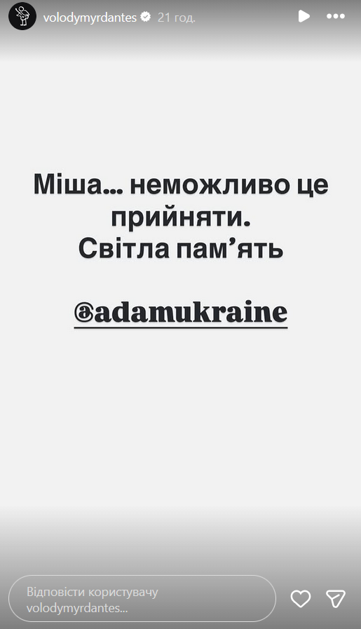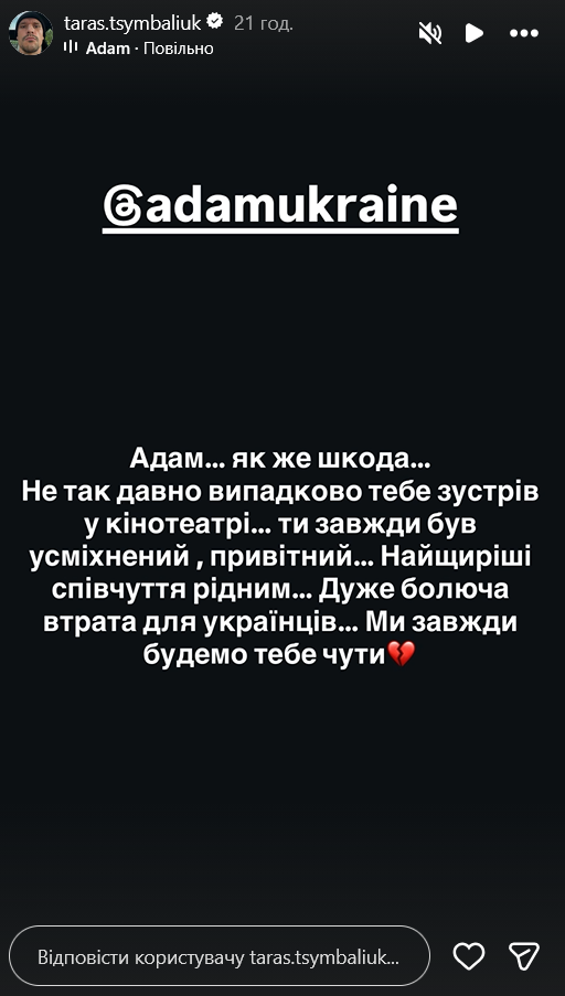 "Адам... как же жаль... Не так давно случайно тебя встретил в кинотеатре... ты всегда был улыбчивым, приветливым... Самые искренние соболезнования родным. Очень болезненная утрата для украинцев... Мы всегда будем тебя слышать", - эмоционально обратился актер к покойному певцу.