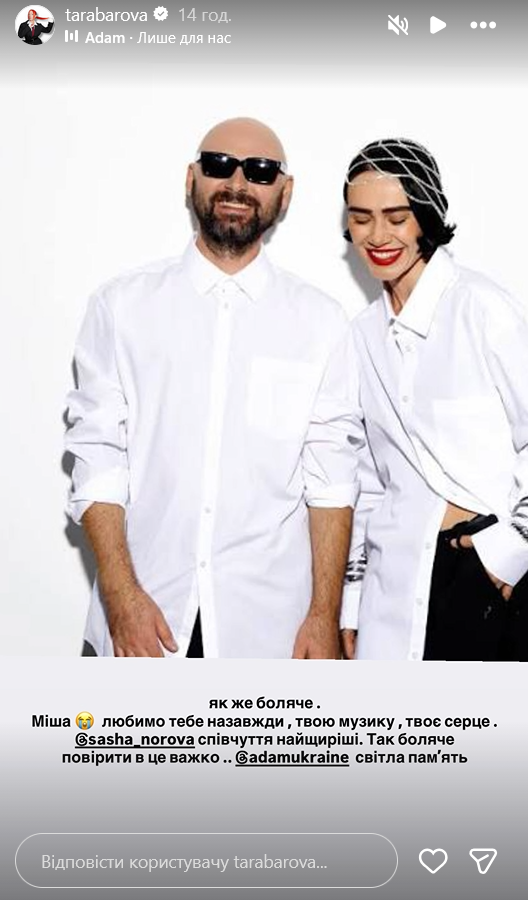 "Как же больно. Миша, любим тебя навсегда, твою музыку, твое сердце. Саша Норова, соболезнования самые искренние. Так больно, поверить в это тяжело. Светлая память", - написала певица TARABAROVA.