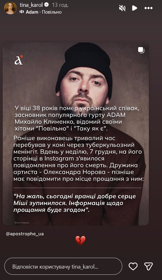 Певица отреагировала на смерть Михаила Клименко эмодзи разбитого сердца.
