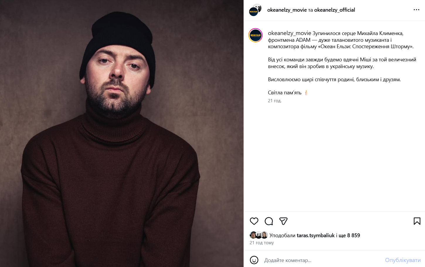 "Остановилось сердце Михаила Клименко, фронтмена ADAM - очень талантливого музыканта и композитора фильма "Океан Эльзы: Наблюдение Шторма". От всей команды всегда будем благодарны Мише за тот огромный вклад, который он внес в украинскую музыку. Выражаем искренние соболезнования семье, близким и друзьям. Светлая память".