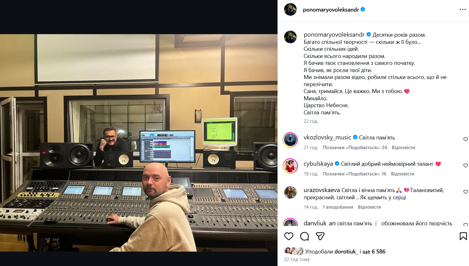 "Михаилу - добрая память. Его музе и попутчице в этом музыкальном купе Александре и их двум деткам - наши самые теплые объятия. Это был проект Мультипоезд, где современные украинские музыканты создавали работы прямо в наших вдохновляющих на творчество поездах", - написал он и показал отрывок создания хита.