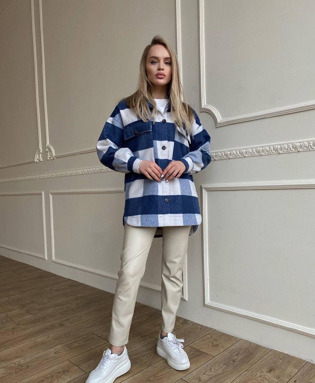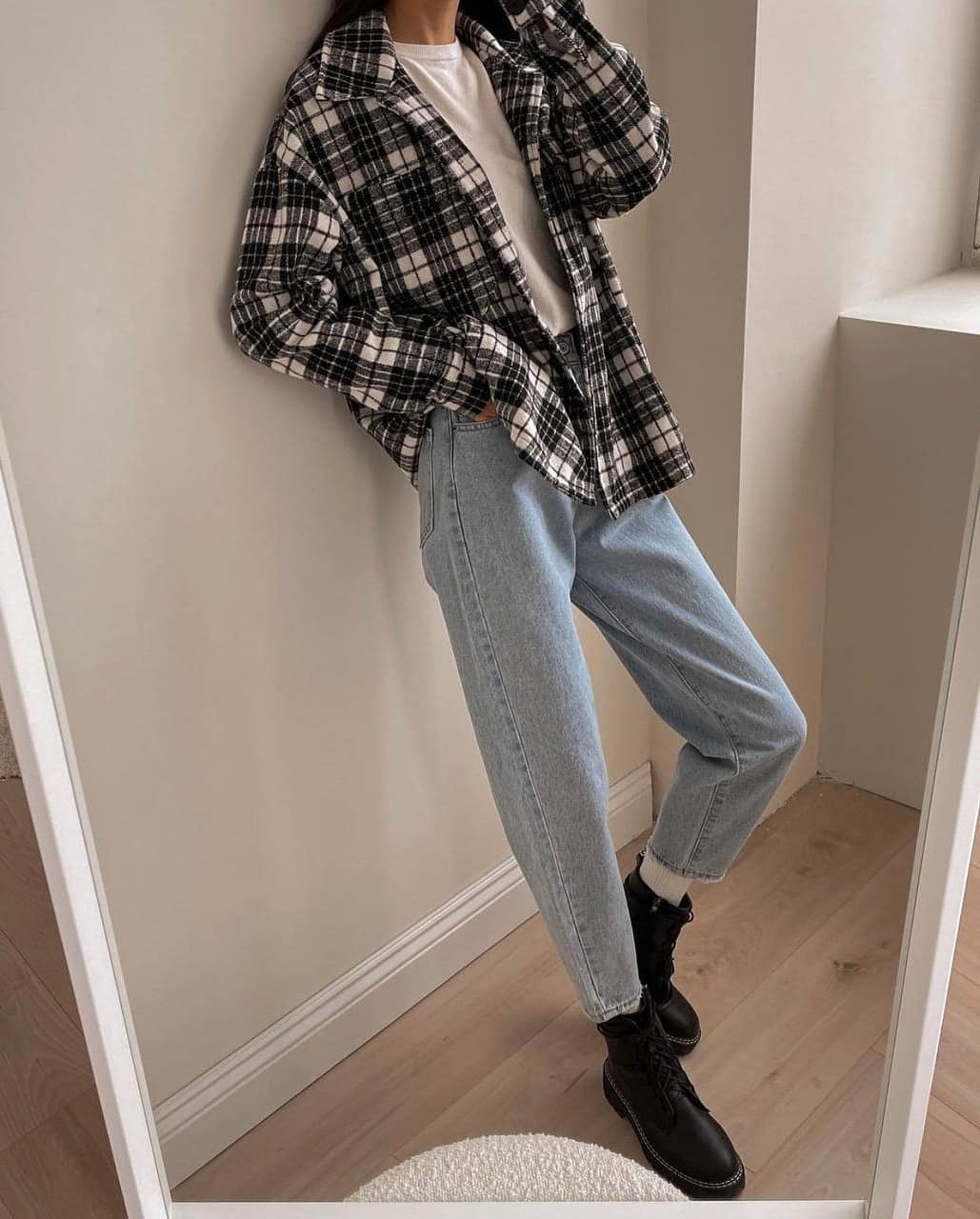 Весной бывает достаточно прохладно, поэтому рубашку можно комбинировать с водолазками и майками, создавая стильные и теплые многослойные образы. Например, для прогулки вы можете выбрать голубые джинсы слоучи, белую футболку и черно-белую рубашку в клетку. Дополнят лук грубые ботинки на шнуровке.