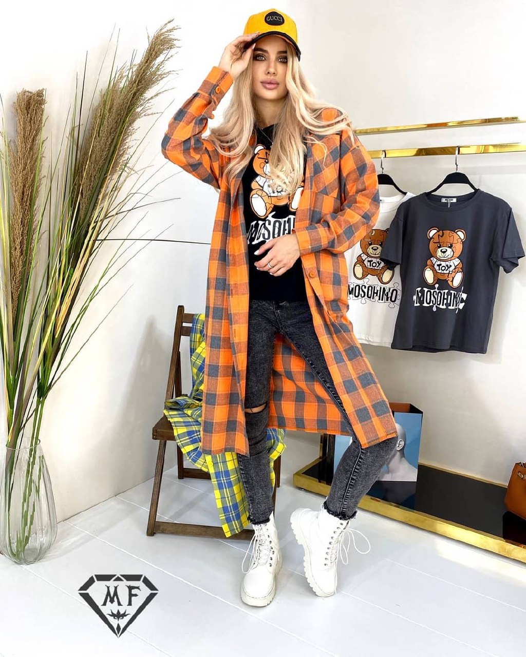 Еще один вариант – удлиненная рубашка с ярким принтом. Эту вещь можно носить как с джинсами, так и с леггинсами, с поясом и без. Дополнит лук стильная кепка и ботинки на тракторной подошве.