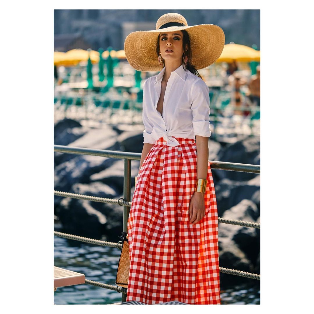 Классическая белая рубашка может стать частью романтического образа. Надевайте юбку макси с высокой линией талии, а рубашку завяжите узлом. Также образ дополнит соломенная шляпа с объемными полями.